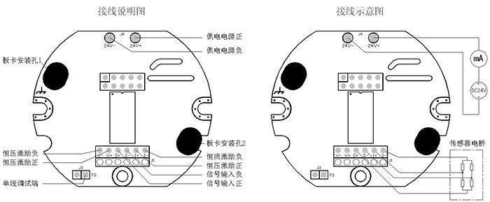 圖中J3為校準通信單線接口。 J1為傳感器接線端子,提供恒壓恒流激勵。 24V+和24V-為變送器兩線制接線口,提供DC24V電源,輸出4~20mA電流信號。 |