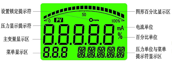 4.2按鍵功能說明 4.2.1功能鍵“M” ?測量模式下短按為開,進入密碼設置。 ?測量模式下長按5秒為進入主變量清零(即PV清零)。 ?設置模式下短按為使能參數(shù)修改,被修改參數(shù)閃爍,再次短按確認參數(shù)修改,被修改參數(shù)停止閃爍。