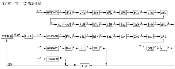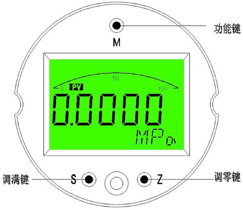 4.2.2調(diào)滿鍵“S” ?測量模式下短按為顯示模式修改功能。 ?測量模式下長按5秒為進入調(diào)滿功能(即標定變送器滿點)。 ?設置模式下為設置參數(shù)加一功能,長按時連續(xù)移位加一。 4.2.3調(diào)零鍵“Z” ?測量模式下短按為顯示模式修改功能。 ?測量模式下長按5秒為進入調(diào)零功能(即標定變送器零點)。 ?設置模式下為設置參數(shù)移位與減一功能,長按時連續(xù)移位或減一。 4.2.4按鍵功能綜述 儀表通過面板的三個按鍵實現(xiàn)所有的參數(shù)輸入和校準數(shù)據(jù)的設置、采集,本儀表的設置和輸入采取了多種優(yōu)化措施來提高客戶的操作速度: ?儀表的移位鍵和增加鍵具有變速率功能。 ?儀表同時具有移位和增量輸入方法,針對需要大量數(shù)修改的菜單使用移位方式,需要連續(xù)輸入數(shù)據(jù)的菜單采取了增量方式。 ?儀表在設置狀態(tài)下會停止模擬輸出,所以如果60秒內(nèi)用戶沒有操作儀表,則會自動退出到測量狀態(tài)。 ?儀表在正常退出菜單的時候才會保存所有設置的參數(shù)。 4.3快捷功能 ?儀表有主變量清零,零點有源遷移,滿點有源遷移三種快捷功能,便于用戶現(xiàn)場的快速設定。 4.3.1主變量清零 主變量清零即PV清零,是相對大氣壓下的零點,不是傳感器量程的零點。將變送器直接置于大氣壓下,長按“M”鍵5秒以上,即可進入主變量清零功能,如右圖,菜單區(qū)顯示“P=0”,通過“S”鍵和“Z”鍵選擇需要進行的操作,提示符區(qū)相應顯示: