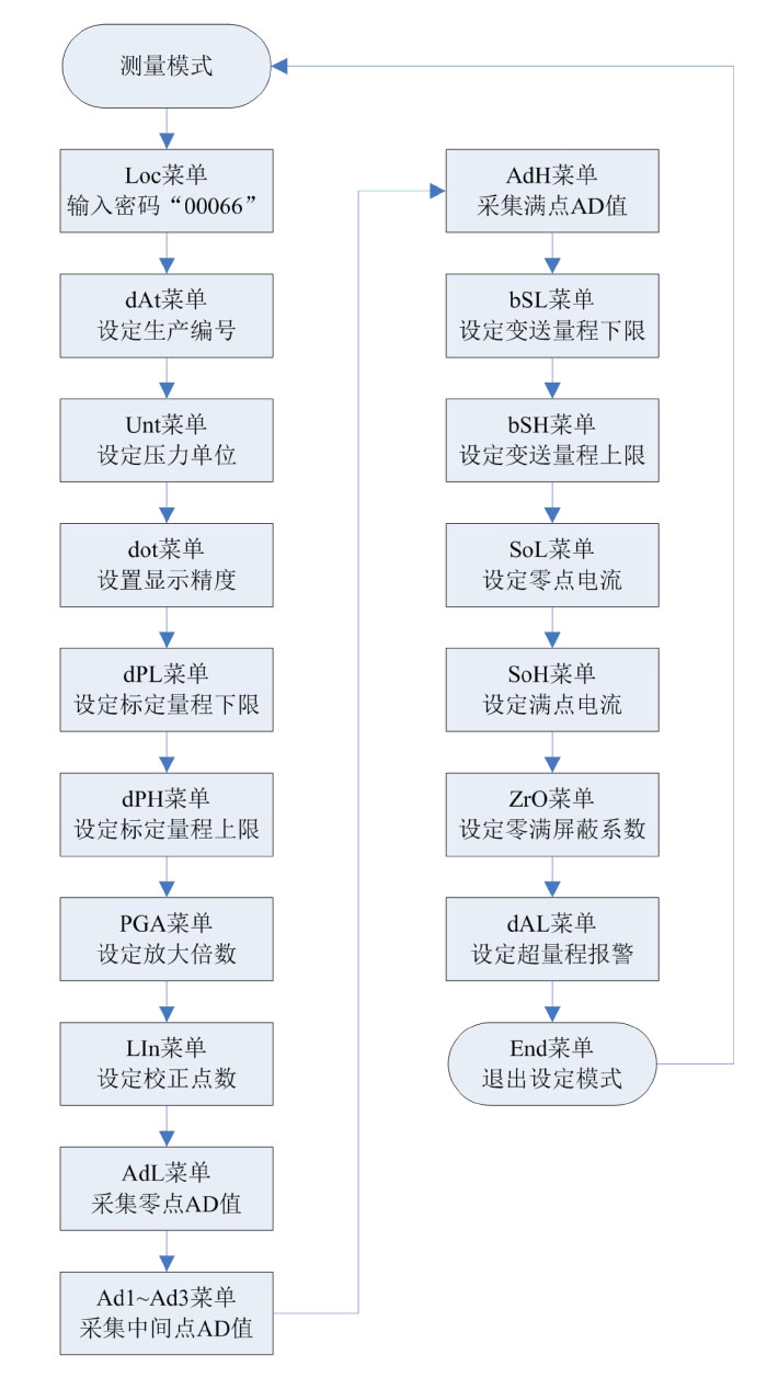 4.5菜單說明 本儀表菜單分為“生產(chǎn)調(diào)試菜單”; “高級用戶菜單”;“普通用戶菜單”三級,由各級菜單的進入密碼做為區(qū)分。 ?“生產(chǎn)調(diào)試菜單” 進入密碼為“00066”,由變送器生產(chǎn)廠家使用,對變送器的基本參數(shù)進行設置,決定了變送器的精度,標定值等參數(shù),因此生產(chǎn)調(diào)試菜單不能對一般用戶開放,以免標定數(shù)據(jù)被破壞。 ?“高級用戶菜單” 進入密碼為“00016”,是針對變送器現(xiàn)場使用要求進行一些特殊設置時使用。 ?“普通用戶菜單” 進入密碼為“00001”,可進行顯示單位,顯示分辨率,以及顯示模式的設定。 注:在高級用戶與用戶菜單設定時,若60秒內(nèi)無任何按鍵操作,將自動退出設定并返回到測量模式。 4.5.1密碼設定菜單 Loc: 密碼輸入菜單,可設范圍(19999~99999),菜單提示符“PIN” 設定菜單進入密碼,若輸入密碼錯誤或30秒內(nèi)無任何按鍵操作,將自動返回測量模式。 4.5.2普通用戶菜單 Unt: 用戶單位設置,可設范圍(0~18),菜單提示符為設定的各個單位 單位設定共有19種,分別為“MPa”,“KPa”,“Pa”,“bar”,“mbar”, “PSI”, “mH2O”, “mmH2O”, “InH2O”, “ftH2O”, “mHg”,“mmHg”, “InHg”,“Kg/cm2”,“atm”,“Torr”,“m”,“cm”,“mm” dot: 顯示精度設置,可設范圍(0~4),菜單提示符為當前壓力單位 顯示分辨率即測量模式時顯示的小數(shù)位數(shù),用戶可根據(jù)現(xiàn)場使用要求對其設定,顯示小數(shù)位數(shù)并非越多越好,應優(yōu)先保證顯示值的穩(wěn)定。同時此菜單值會受到標定時變送器最大顯示值的限制,若設定的小數(shù)點顯示位數(shù)在顯示變送器最大顯示值時超出5位顯示范圍時,則設定的小數(shù)位數(shù)會被限制在保證最大顯示值能被正常顯示的范圍內(nèi)。 例如:變送器標定范圍為0.0000~20.000MPa;則顯示精度的設定范圍為(0~3),若顯示精度設定值為4時,最大顯示值將超出最大5位的顯示范圍 SHO: 顯示模式設定,可設范圍(0~5) “0”--顯示主變量,提示符“-PV-” “1”--顯示電流, 提示符“-mA-” “2”--顯示百分比,提示符“-%-” “3”--主變量與電流交替顯示, 提示符“PV-mA” “4”--主變量與百分比交替顯示,提示符“PV--%” “5”--電流與百分比交替顯示, 提示符“mA--%” 4.5.3高級用戶菜單 FIL: 濾波常數(shù)設定,可設范圍(0~2) “0”—濾波低,提示符“LOW” “1”--濾波中,提示符“MId” “2”--濾波高,提示符“HIg” 濾波常數(shù)值設定越大,對干擾的抑制能力越強,但靈敏度會下降,生產(chǎn)標定時本菜單值默認值為“1”為中等濾波效果,能適應大多數(shù)的應用場合。 bSL: 變送量程下限設定,可設范圍(-19999~99999),菜單提示符顯示當前壓力單位。 此功能可實現(xiàn)變送輸出的零點無源遷移,其設定的壓力值將對應到“SoL”零點電流菜單設定電流值,為了方便用戶設定,此菜單中的小數(shù)點位置可通過按鍵進行設定,以便用戶能快速設定需要的數(shù)值。 變送器的變送最小量程可按傳感器量程的3:1進行壓縮,最大量程可按傳感器量程的1:1進行設置,超出此范圍將影響變送輸出精度。 bSH: 變送量程上限設定,可設范圍(-19999~99999),菜單提示符顯示當前壓力單位。 此功能可實現(xiàn)變送輸出的滿點無源遷移,其設定的壓力值將對應到“SoH”滿點電流菜單設定電流值,為了方便用戶設定,此菜單中的小數(shù)點位置可通過按鍵進行設定,以便用戶能快速設定需要的數(shù)值。 變送器的變送最小量程可按傳感器量程的3:1進行壓縮,最大量程可按傳感器量程的1:1進行設置。超出此范圍將影響變送輸出精度。 SoL: 零點電流微調(diào),可設范圍(-150~200) 設定此菜單時,儀表將交替顯示工廠設定的零點電流值與零點電流D/A微調(diào)值,同時變送器輸出設定的電流值,當顯示設定的零點輸出電流值時菜單提示符顯示“L-OUT,顯示零點電流D/A微調(diào)值時菜單提示符顯示“L-D/A”,變送器使用過程中若輸出的零點電流值存在誤差時,可在變送器電源回路中串接電流表,通過“S”和“Z”對零點電流值進行微調(diào),電流微調(diào)范圍約±0.2mA 。 SoH: 滿點電流微調(diào),可設范圍(-150~200) 設定此菜單時,儀表將交替顯示工廠設定的滿點電流值與滿點電流D/A微調(diào)值,同時變送器輸出設定的電流值,當顯示設定的滿點輸出電流值時菜單提示符顯示“H-OUT”,顯示滿點電流D/A微調(diào)值時菜單提示符顯示“H-D/A”,變送器使用過程中若輸出的滿點電流值存在誤差時,可在變送器電源回路中串接電流表,通過“S”和“Z”對滿點電流值進行微調(diào),電流微調(diào)范圍約±0.2mA 。 ZrO: 零滿屏蔽系數(shù),可設范圍(0.00~1.00),菜單提示符“%” 此菜單設定值表示零點和滿點的屏蔽范圍,例如:菜單值設定為0.10時表示當變送器輸出接近零點或滿點加減變送量程的0.10%時,變送器輸出會自動穩(wěn)定在零點或滿點上,不會出現(xiàn)因干擾而輸出跳動的現(xiàn)象。 dAL: 超量程報警開關,可設范圍(0~1) 此設定值表示當壓力值超出傳感器量程上限的125%或低于量程下限的25%時顯示會閃爍提示。 “0”—關閉報警功能,提示符“NO” “1”—打開報警功能,提示符“YES” oFS: 顯示偏移值,可設范圍(-19999~99999),菜單提示符顯示當前的壓力單位 通過對此菜單值的設定,可以對變送器顯示與輸出值進行偏移,此菜單出廠默認值為0,一般情況下